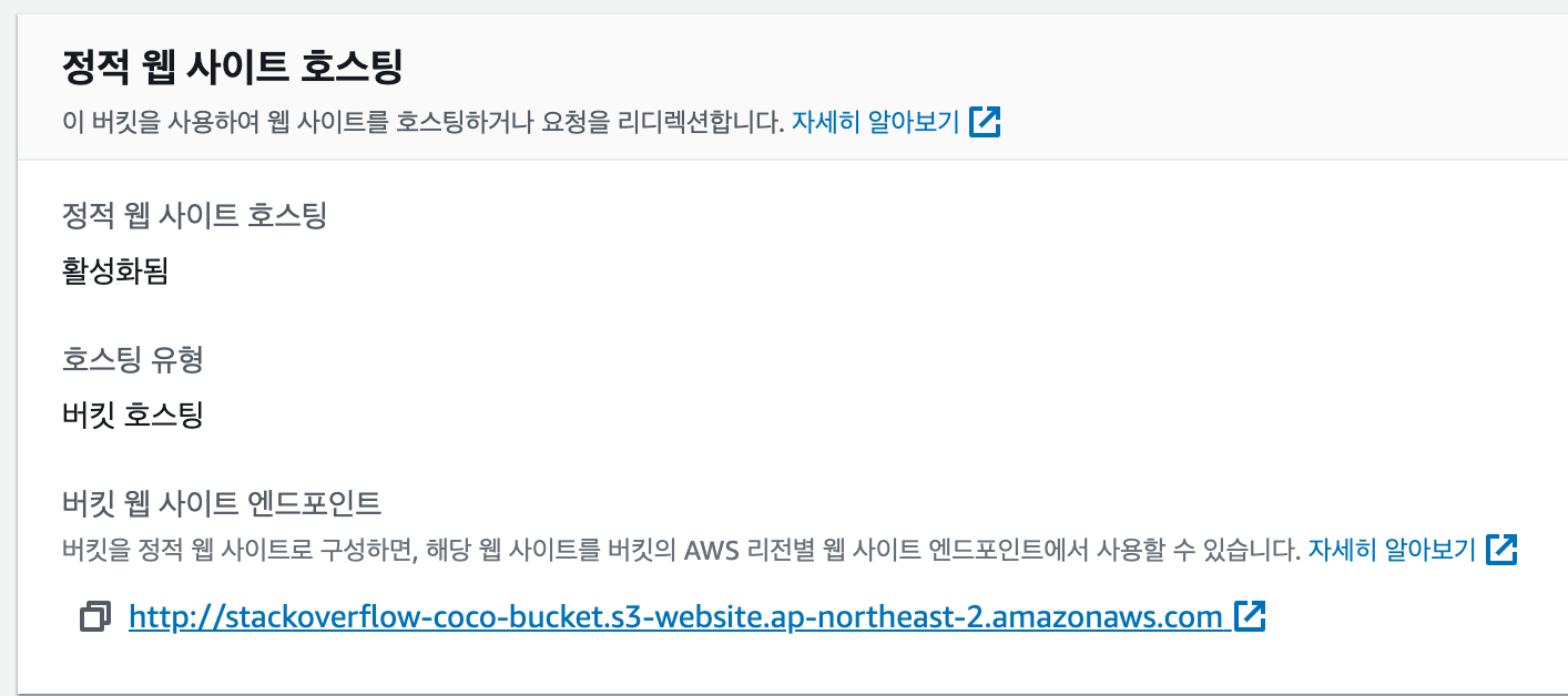 6) 버킷엔드포인트가 생성되는데, 앞으로 이 주소를 통해 웹 프론트에 접근할 수 있게 된다!