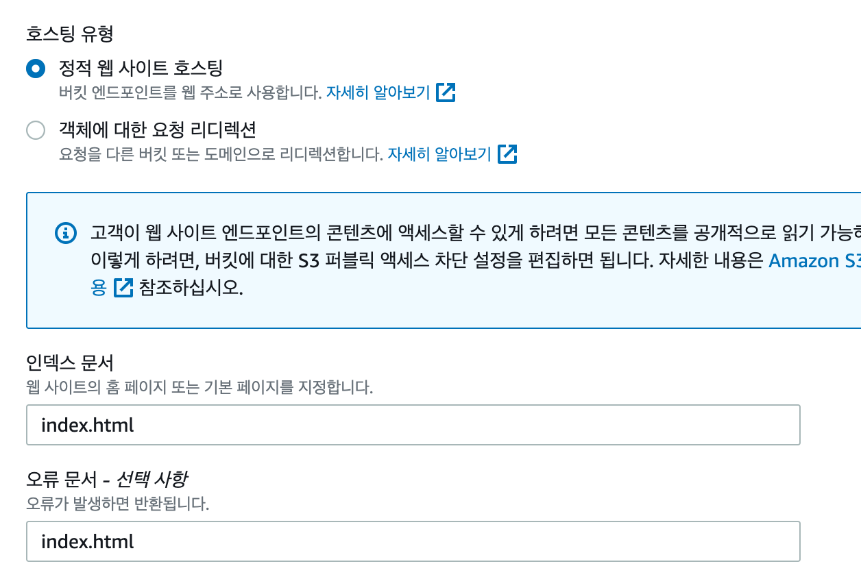 인덱스문서와 오류문서를 둘다 index.html로 설정했다.