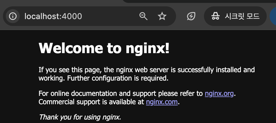 localhost:4000을 입력하면 80 으로 넘어가서 잘 화면이 나오는 것을 확인할 수 있다.